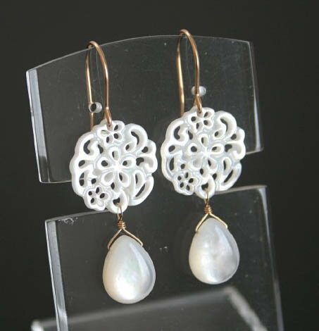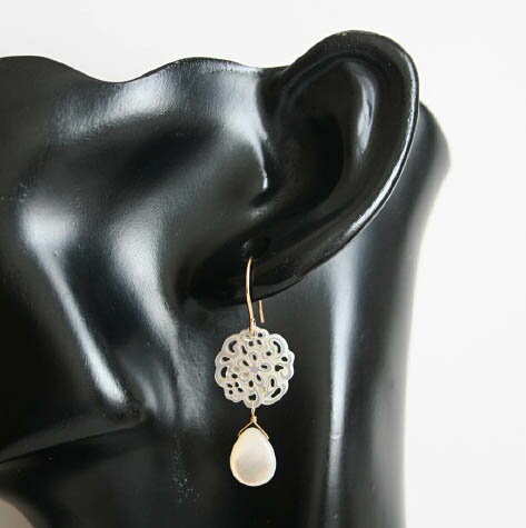 素材 14KGF 雫シェル 約10×8ミリ前後 透かしシェル 約14ミリ フックから下の長さ 約26ミリ レースのような お花の透かし彫りのホワイトシェルに 雫型のシェルを揺らしたピアス。