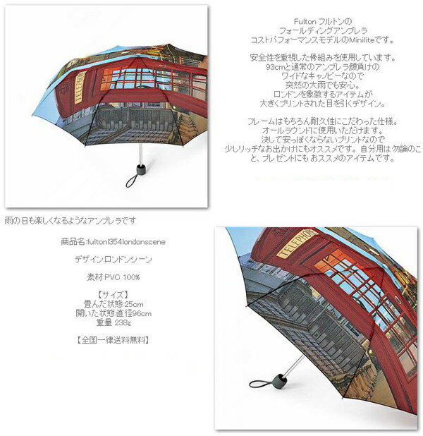 フルトン 傘 Fulton ミニライト ロンドンシーン 雨の日も楽しくなるようなアンブレラです 商品名:fultonl354londonscene デザイン:ロンドンシーン 素材:ポリエステル 100% 【サイズ】 畳んだ状態:25cm 開いた状態:直径96cm 重量 238g 【全国一律送料無料】 レディース スタンダード傘 一覧はこちら! FULTON 一覧はこちら! Fulton フルトンの フォールディングアンブレラ コストパフォーマンスモデルのMiniliteです。